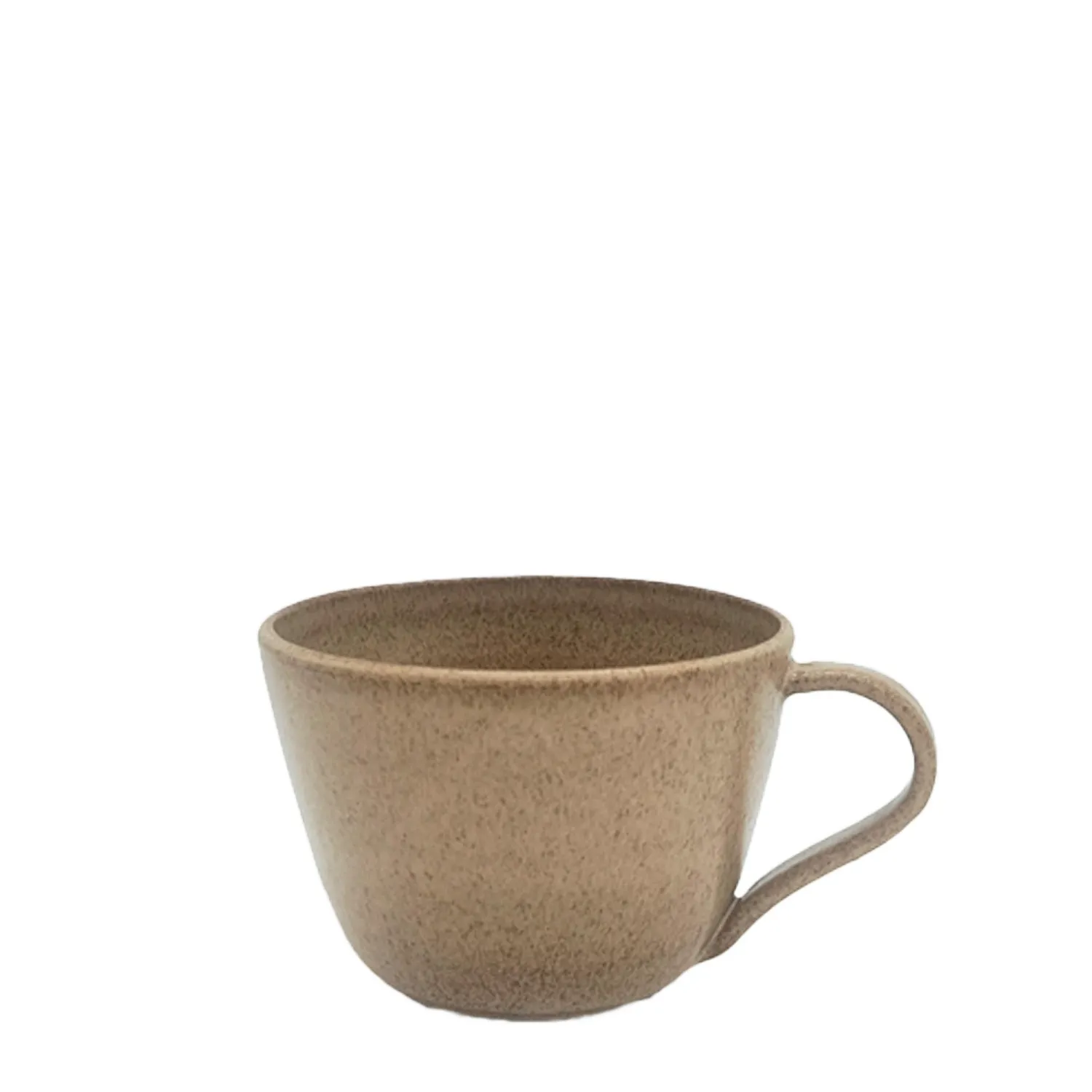 Tea cup fra det danske keramiker Sarah Dannesboe. Kopperne er håndlavet af grå stentøjsler med lavaprikker og glaseret i en semi-mat sandbeige glasur, der kan variere i finish.