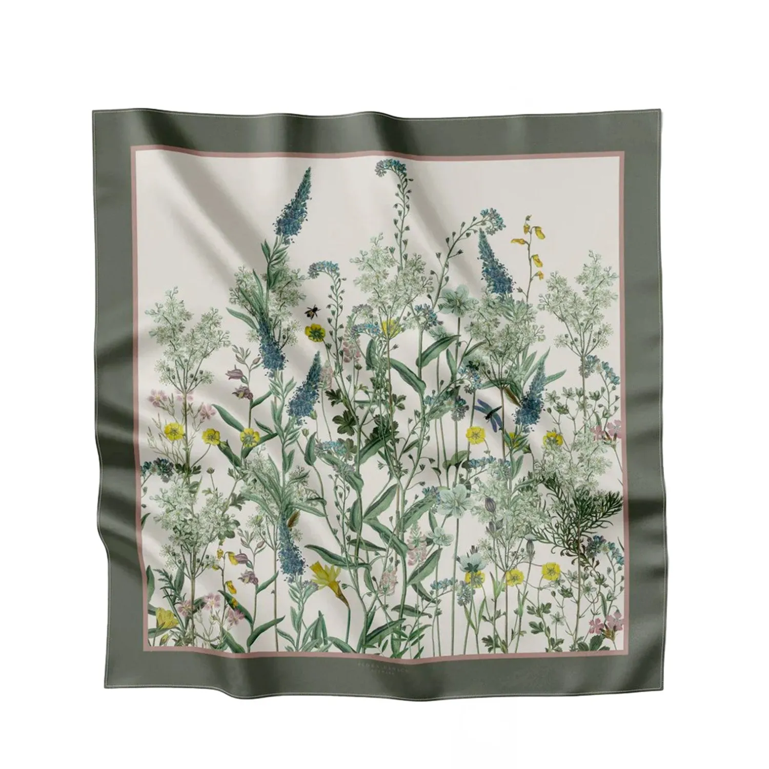 Tørklæde, Wild Bloom, i 100% silke twill fra Flora Danica. Tørklædet er et levende silkeportræt af den vilde danske flora. Inspireret af de originale Flora Danica-illustrationer fremstår tørklædet som et botanisk herbarium i fuldt flor – med fine sommerblomster, summende insekter og et rigt farvespil i grønt, gult, blå og rosa.