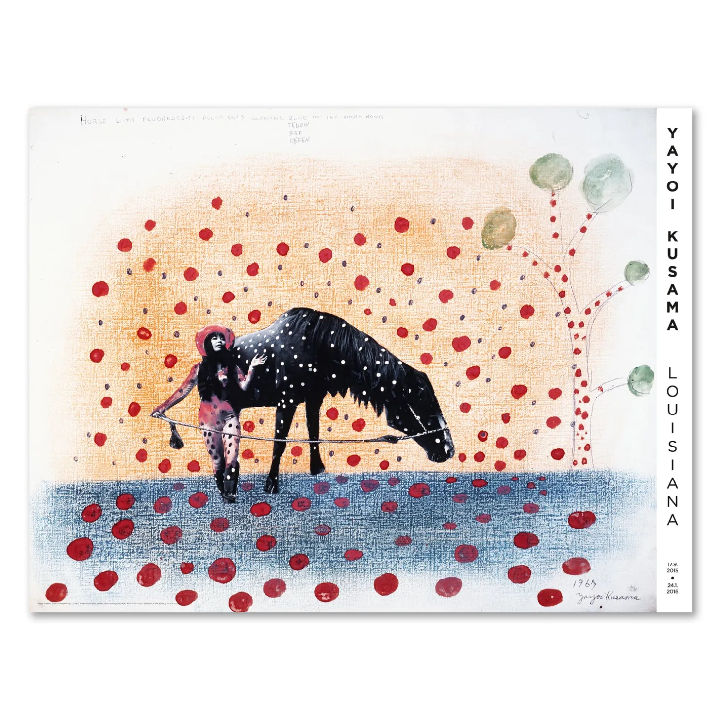 Louisiana plakat med værket, Self-Obliteration No. 2, (1967), af den japanske kunstner, Yayoi Kusama, (f. 1929). Præsentationen af Kusamas livsværk på Louisiana, Kusama – i Uendeligheden, i 2016-2017, var den første retrospektive udstilling af kunstnerens værk i Skandinavien, og blev en af de mest besøgte udstillinger i Louisianas historie.
